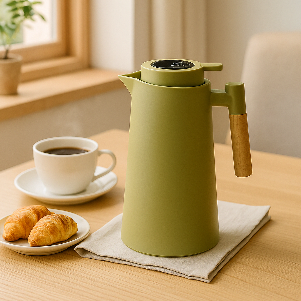 Isolierkanne aus Glas mit Temperaturanzeige und Holzgriff